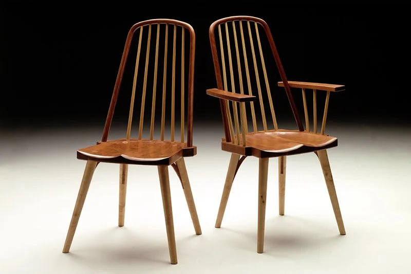 Modern Windsor Variation Chairs: This bowback chair was designed as a lighter, less massive, version of the Contemporary Windsor Side Chair , it “sits’ the same but has fewer spindles, a slightly cut-down seat and laminated braces instead of stretchers. Pictured in cherry with ash spindles and maple legs. See the following links to see the original version of my Contemporary Windsor Chair: