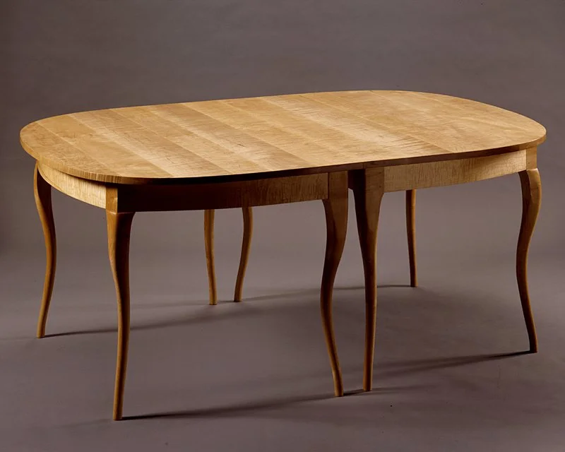 Contemporary Cabriole Leg Table: I present another example of a table with gazelle legs. This extension table is similar in overall dimensions to Arabella's Banquet Table (aka: Pencil-leg Dining Table). The owners of the two different tables are brothers. I bent laminated the tiger maple skirts, added a solid tiger maple top along with plain maple legs, and two leaves to make this oval extension table seat 6-10 comfortably.