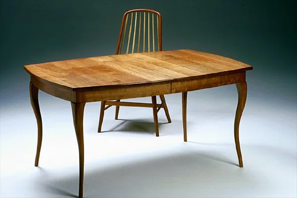 Gazelle Leg Table: the first of two contemporary cabriole leg dining tables that I designed with this leg. My design was inspired by traditional Queen Anne Cabriole Legs and I have always liked the graceful curve of the style. This table has 4 legs and comes with one 22" leaf. It is pictured here in cherry with a natural finish. I built the first of these on speculation very early in my career during a lull in orders.