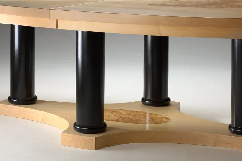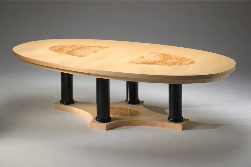Oval Biedermeier Dining Table: I veneered this pedestal based table with a combination of maple and and mappa burl. To decrease weight I glued baltic birch plywood to the very light corrugated cardboard core. I then added a curved laminated maple band around the periphery. The maple veneer with mappa burl insets cover these core boxes. I halved the top for mobility. The base is a sandwich of solid baltic birch plywood with laminated maple edging. I turned the poplar legs on a lathe and painted them black. Finally I sprayed the whole table with DuraVar catalyzed laquer. I have used this construction technique to build other large tables as well. See: Conference Table