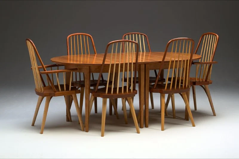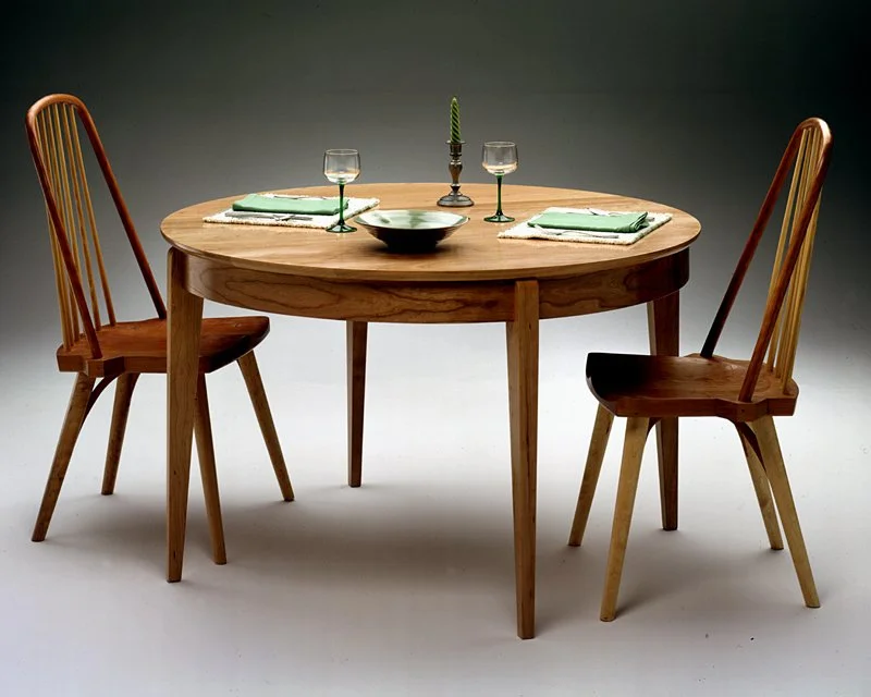Ming Shaker Round Table: The photo shows a 48″diameter cherry round table with two of the Contemporary Windsor Variation Side Chairs. I have made this table in larger and smaller diameters. The table pictured is solid, but could made as a round extension table. I also make an oval and oval extension version.